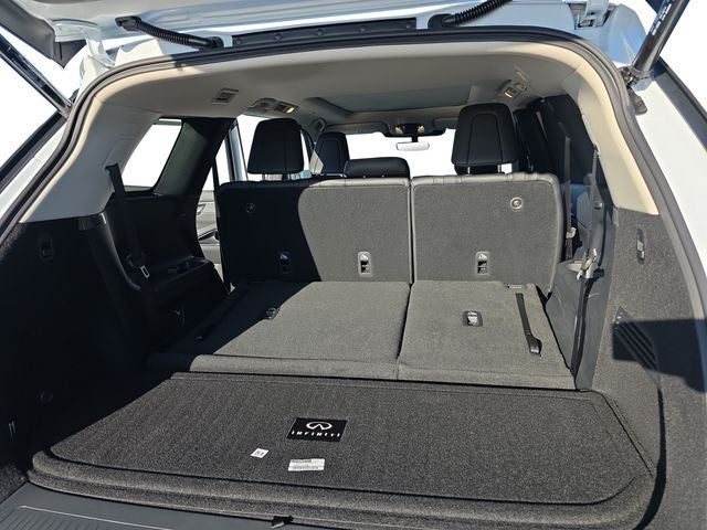 Cargo Package (Clear Rear Bumper Film), 17 Speakers, 3rd row seats: bench, 4-Wheel Disc Brakes, ABS brakes, Air Conditioning, Alloy wheels, AM/FM radio: SiriusXM with 360L, Anti-whiplash front head restraints, Apple CarPlay/Android Auto, Auto High-beam Headlights, Auto tilt-away steering wheel, Auto-dimming door mirrors, Auto-dimming Rear-View mirror, Automatic temperature control, Bose Performance Series 17-Speaker Sound System, Brake assist, Bumpers: body-color, Carpeted Floor Mats with Bench Seats on 3rd Row Tray, Climate Controlled Front Bucket Seats, Delay-off headlights, Driver door bin, Driver vanity mirror, Dual front impact airbags, Dual front side impact airbags, Electronic Stability Control, Emergency communication system: INFINITI InTouch, Four wheel independent suspension, Front anti-roll bar, Front Bucket Seats, Front Center Armrest, Front dual zone A/C, Front reading lights, Fully automatic headlights, Garage door transmitter: HomeLink, Heated door mirrors, Heated front seats, Heated rear seats, Heated steering wheel, Illuminated entry, Knee airbag, Leather Shift Knob, Leather steering wheel, Literature Kit, Low tire pressure warning, Memory seat, Navigation system: Google Built-in, Occupant sensing airbag, Outside temperature display, Overhead airbag, Overhead console, Panic alarm, Passenger door bin, Passenger vanity mirror, Power door mirrors, Power driver seat, Power Liftgate, Power moonroof: Panoramic, Power passenger seat, Power steering, Power windows, Radio data system, Radio: Klipsch Premium Audio System, Rain sensing wipers, Rear air conditioning, Rear anti-roll bar, Rear reading lights, Rear seat center armrest, Rear side impact airbag, Rear window defroster, Rear window wiper, Reclining 3rd row seat, Remote keyless entry, Security system, Speed control, Speed-sensing steering, Speed-Sensitive Wipers, Splash Guards, Split folding rear seat, Spoiler, Steering wheel memory, Steering wheel mounted audio controls, Super Premium Paint, Tachometer, Tailorfit-Appointed Seating Surfaces, Telescoping steering wheel, Tilt steering wheel, Traction control, Trip computer, Turn signal indicator mirrors, Variably intermittent wipers, Ventilated front seats, and Wheels: 20 x 8J Machined Aluminum Alloy.