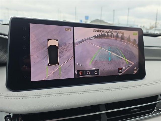 Cargo Package (Clear Rear Bumper Film), 17 Speakers, 3rd row seats: bench, 4-Wheel Disc Brakes, ABS brakes, Air Conditioning, Alloy wheels, AM/FM radio: SiriusXM with 360L, Anti-whiplash front head restraints, Apple CarPlay/Android Auto, Auto High-beam Headlights, Auto tilt-away steering wheel, Auto-dimming door mirrors, Auto-dimming Rear-View mirror, Automatic temperature control, Bose Performance Series 17-Speaker Sound System, Brake assist, Bumpers: body-color, Carpeted Floor Mats with Bench Seats on 3rd Row Tray, Climate Controlled Front Bucket Seats, Delay-off headlights, Driver door bin, Driver vanity mirror, Dual front impact airbags, Dual front side impact airbags, Electronic Stability Control, Emergency communication system: INFINITI InTouch, Four wheel independent suspension, Front anti-roll bar, Front Bucket Seats, Front Center Armrest, Front dual zone A/C, Front reading lights, Fully automatic headlights, Garage door transmitter: HomeLink, Heated door mirrors, Heated front seats, Heated rear seats, Heated steering wheel, Illuminated entry, Knee airbag, Leather Shift Knob, Leather steering wheel, Literature Kit, Low tire pressure warning, Memory seat, Navigation system: Google Built-in, Occupant sensing airbag, Outside temperature display, Overhead airbag, Overhead console, Panic alarm, Passenger door bin, Passenger vanity mirror, Power door mirrors, Power driver seat, Power Liftgate, Power moonroof: Panoramic, Power passenger seat, Power steering, Power windows, Premium Paint, Radio data system, Radio: Klipsch Premium Audio System, Rain sensing wipers, Rear air conditioning, Rear anti-roll bar, Rear reading lights, Rear seat center armrest, Rear side impact airbag, Rear window defroster, Rear window wiper, Reclining 3rd row seat, Remote keyless entry, Security system, Speed control, Speed-sensing steering, Speed-Sensitive Wipers, Splash Guards, Split folding rear seat, Spoiler, Steering wheel memory, Steering wheel mounted audio controls, Tachometer, Tailorfit-Appointed Seating Surfaces, Telescoping steering wheel, Tilt steering wheel, Traction control, Trip computer, Turn signal indicator mirrors, Variably intermittent wipers, Ventilated front seats, and Wheels: 20 x 8J Machined Aluminum Alloy.