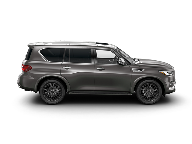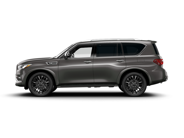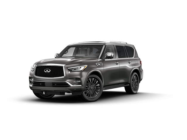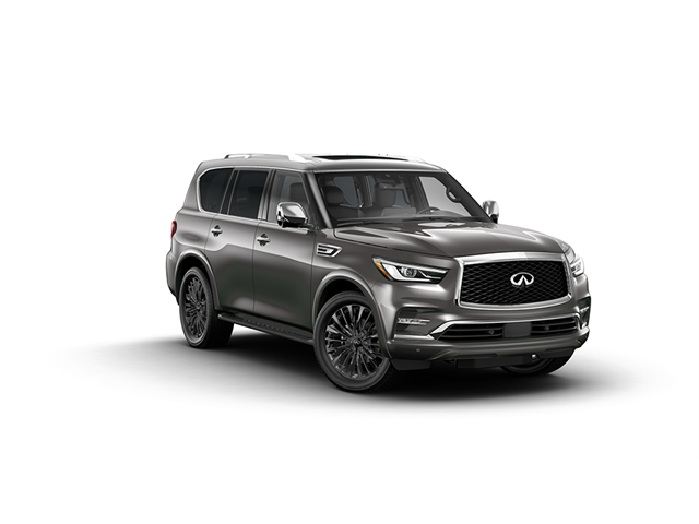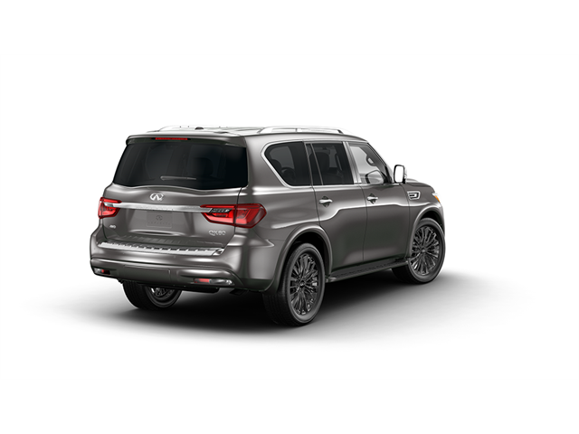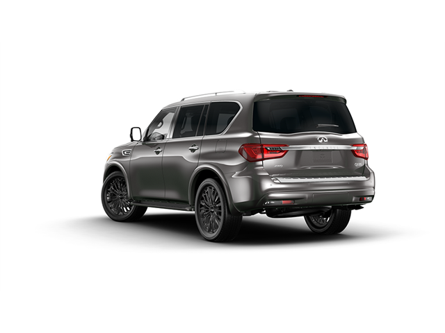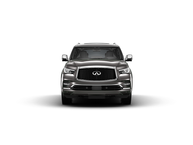 Cargo Package (Cargo Net, Carpeted Cargo Mat, Center Console Tray, Console Net, and First-Aid Kit), 17 Speakers, 2.937 Axle Ratio, 3rd row seats: split-bench, 4-Wheel Disc Brakes, ABS brakes, Air Conditioning, Alloy wheels, AM/FM radio: SiriusXM, Anti-whiplash front head restraints, Auto High-beam Headlights, Auto tilt-away steering wheel, Auto-dimming door mirrors, Auto-dimming Rear-View mirror, Auto-leveling suspension, Automatic temperature control, Brake assist, Bumpers: body-color, Climate Controlled Front Bucket Seats, Compass, Delay-off headlights, Driver door bin, Driver vanity mirror, Dual front impact airbags, Dual front side impact airbags, Electronic Stability Control, Emergency communication system: INFINITI InTouch, Four wheel independent suspension, Front anti-roll bar, Front Bucket Seats, Front Center Armrest, Front dual zone A/C, Front fog lights, Front reading lights, Fully automatic headlights, Garage door transmitter: HomeLink, Heated door mirrors, Heated front seats, Heated rear seats, Heated steering wheel, Illuminated entry, INFINITI Radiant Illuminated Kick Plates, Leather Shift Knob, Leather steering wheel, Literature Kit, Low tire pressure warning, Memory seat, Midyear Change, Navigation system: INFINITI InTouch Navigation, Occupant sensing airbag, Outside temperature display, Overhead airbag, Overhead console, Panic alarm, Passenger door bin, Passenger vanity mirror, Perforated Semi-Aniline Leather-Appointed Seats, Power door mirrors, Power driver seat, Power Liftgate, Power moonroof, Power passenger seat, Power steering, Power windows, Premium audio system: Bose, Radio data system, Radio: Bose Performance Audio System w/17 Speakers, Rain sensing wipers, Rear air conditioning, Rear anti-roll bar, Rear reading lights, Rear seat center armrest, Rear window defroster, Rear window wiper, Rear-Seat Entertainment, Reclining 3rd row seat, Remote keyless entry, Roof Rail Cross Bars, Security system, Speed control, Speed-sensing steering, Split folding rear seat, Spoiler, Steering wheel memory, Steering wheel mounted audio controls, Tachometer, Telescoping steering wheel, Tilt steering wheel, Traction control, Trip computer, Turn signal indicator mirrors, Variably intermittent wipers, Ventilated front seats, Voltmeter, and Wheels: 22 x 8.0 Dark Chrome Cast Aluminum-Alloy.