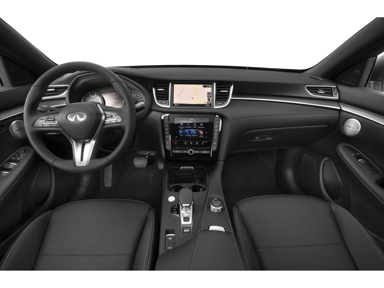 16 Speakers, 4-Wheel Disc Brakes, ABS brakes, Air Conditioning, Alloy wheels, AM/FM radio: SiriusXM, Auto High-beam Headlights, Auto tilt-away steering wheel, Auto-dimming Rear-View mirror, Automatic temperature control, Black Splash Guards (Set of 4), Brake assist, Bumpers: body-color, Carpeted Floor Mats, CD player, Climate Controlled Front Bucket Seats, Delay-off headlights, Driver door bin, Driver vanity mirror, Dual front impact airbags, Dual front side impact airbags, Electronic Stability Control, Emergency communication system: INFINITI InTouch, Exclusive Paint, Exterior Parking Camera Rear, Four wheel independent suspension, Front anti-roll bar, Front Bucket Seats, Front Center Armrest, Front dual zone A/C, Front fog lights, Front reading lights, Garage door transmitter, Heated door mirrors, Heated front seats, Heated steering wheel, Illuminated entry, Illuminated Kick Plates, Knee airbag, Leather Shift Knob, Leather steering wheel, Leather-Appointed Seat Trim, Literature Kit, Low tire pressure warning, Memory seat, Navigation system: INFINITI InTouch Navigation, Occupant sensing airbag, Outside temperature display, Overhead airbag, Overhead console, Panic alarm, Passenger door bin, Passenger vanity mirror, Power door mirrors, Power driver seat, Power Liftgate, Power moonroof, Power passenger seat, Power steering, Power windows, Radio data system, Radio: Bose Performance Series Premium Audio, Rain sensing wipers, Rear anti-roll bar, Rear reading lights, Rear seat center armrest, Rear side impact airbag, Rear window defroster, Rear window wiper, Remote keyless entry, Security system, Speed control, Speed-sensing steering, Speed-Sensitive Wipers, Split folding rear seat, Spoiler, Steering wheel memory, Steering wheel mounted audio controls, Tachometer, Telescoping steering wheel, Tilt steering wheel, Traction control, Trip computer, Turn signal indicator mirrors, Variably intermittent wipers, Ventilated front seats, and Wheels: 8.5J x 20 Machine Finished Aluminum Alloy.