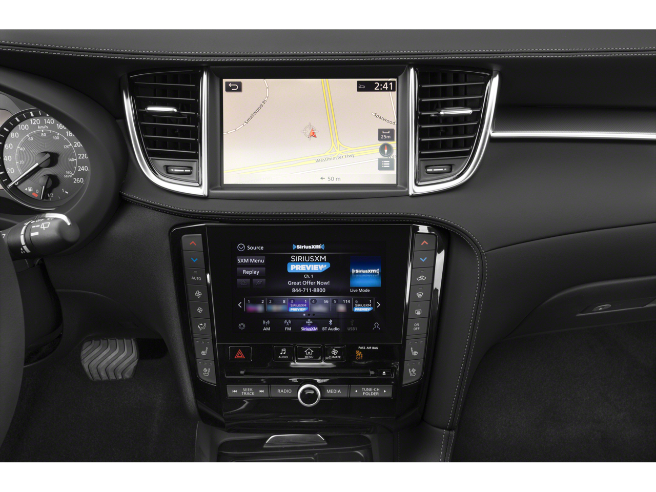 - Radio: Bose Performance Series Premium Audio -inc: 16 speakers, metallic speaker grilles on tweeters, INFINITI InTouch w/navigation and dual display system w/upper 8" and lower 7" touch screens, wireless Apple CarPlay, Android Auto, HD Radio technology, SiriusXM radio w/advanced audio features and 90-day complimentary trial, SiriusXM Traffic w/3-month complimentary trial, SiriusXM Travel Link w/3 months complimentary trial, INFINITI voice recognition, INFINITI InTouch services, Siri eyes free and Wi-Fi hotspot