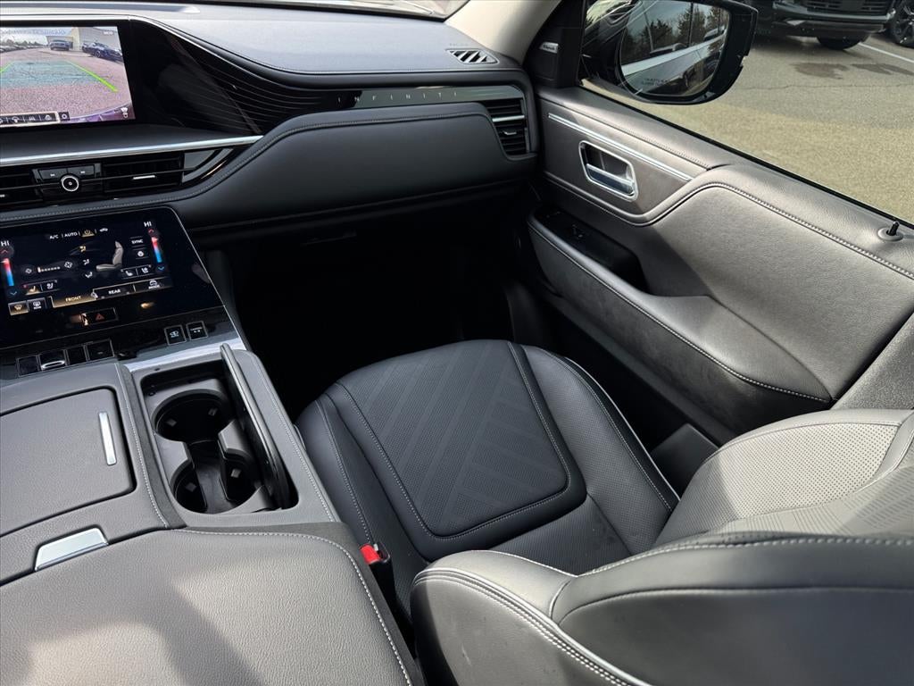 14 Speakers, 3rd row seats: bench, 4-Wheel Disc Brakes, ABS brakes, Adaptive suspension, Air Conditioning, Alloy wheels, AM/FM radio: SiriusXM with 360L, Anti-whiplash front head restraints, Apple CarPlay/Android Auto, Audio memory, Auto High-beam Headlights, Auto tilt-away steering wheel, Auto-dimming door mirrors, Auto-dimming Rear-View mirror, Auto-leveling suspension, Automatic temperature control, Brake assist, Bumpers: body-color, Climate Controlled Front Bucket Seats, Compass, Delay-off headlights, Driver door bin, Driver vanity mirror, Dual front impact airbags, Dual front side impact airbags, Electronic Stability Control, Emergency communication system: INFINITI InTouch, Four wheel independent suspension, Front anti-roll bar, Front Bucket Seats, Front Center Armrest, Front dual zone A/C, Front reading lights, Fully automatic headlights, Garage door transmitter: myQ Connected Garage, Heads-Up Display, Heated door mirrors, Heated front seats, Heated rear seats, Heated steering wheel, HVAC memory, Illuminated entry, Knee airbag, Leather Seating Surfaces, Leather steering wheel, Low tire pressure warning, Memory seat, Navigation system: Google Built-in, Occupant sensing airbag, Outside temperature display, Overhead airbag, Overhead console, Panic alarm, Passenger door bin, Passenger vanity mirror, Power door mirrors, Power driver seat, Power Liftgate, Power moonroof, Power passenger seat, Power steering, Power windows, Radiant Front & Rear Doors Illuminated Kick Plates, Radio data system, Radio: Klipsch Premium Audio System w/14 Speakers, Rain sensing wipers, Rear air conditioning, Rear anti-roll bar, Rear reading lights, Rear seat center armrest, Rear window defroster, Rear window wiper, Reclining 3rd row seat, Remote keyless entry, Security system, Speed control, Speed-sensing steering, Split folding rear seat, Spoiler, Steering wheel memory, Steering wheel mounted audio controls, Tachometer, Telescoping steering wheel, Tilt steering wheel, Traction control, Trip computer, Turn signal indicator mirrors, Variably intermittent wipers, Ventilated front seats, Ventilated rear seats, and Wheels: 22 x 8 Cast Aluminum Alloy.
